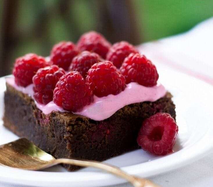 - Line a baking tray with parchment paper and pour in the mixture, levelling the surface with a wide knife. Sprinkle the raspberries on top, pushing them gently into the mixture until they are three-quarters submerged. The melted chocolate makes this a dense mixture, so the raspberries will sit on top if you don't give them a push.