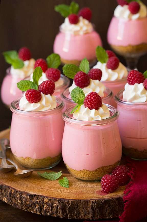 A truly delicious treat! These irresistible mousse cups are layered with a no-bake graham cracker crust and a decadent cheesecake flavored mousse made with fresh raspberries, cream and cream cheese. What more could you want in a dessert!