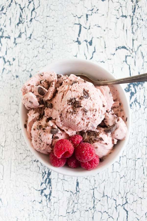 This raspberry chocolate chip ice cream is the perfect addition to your summer menu. It is slightly sweet, full of fresh berry flavor, and packed with dark chocolate chips. You’ll love how easy it is to make your own ice cream!
