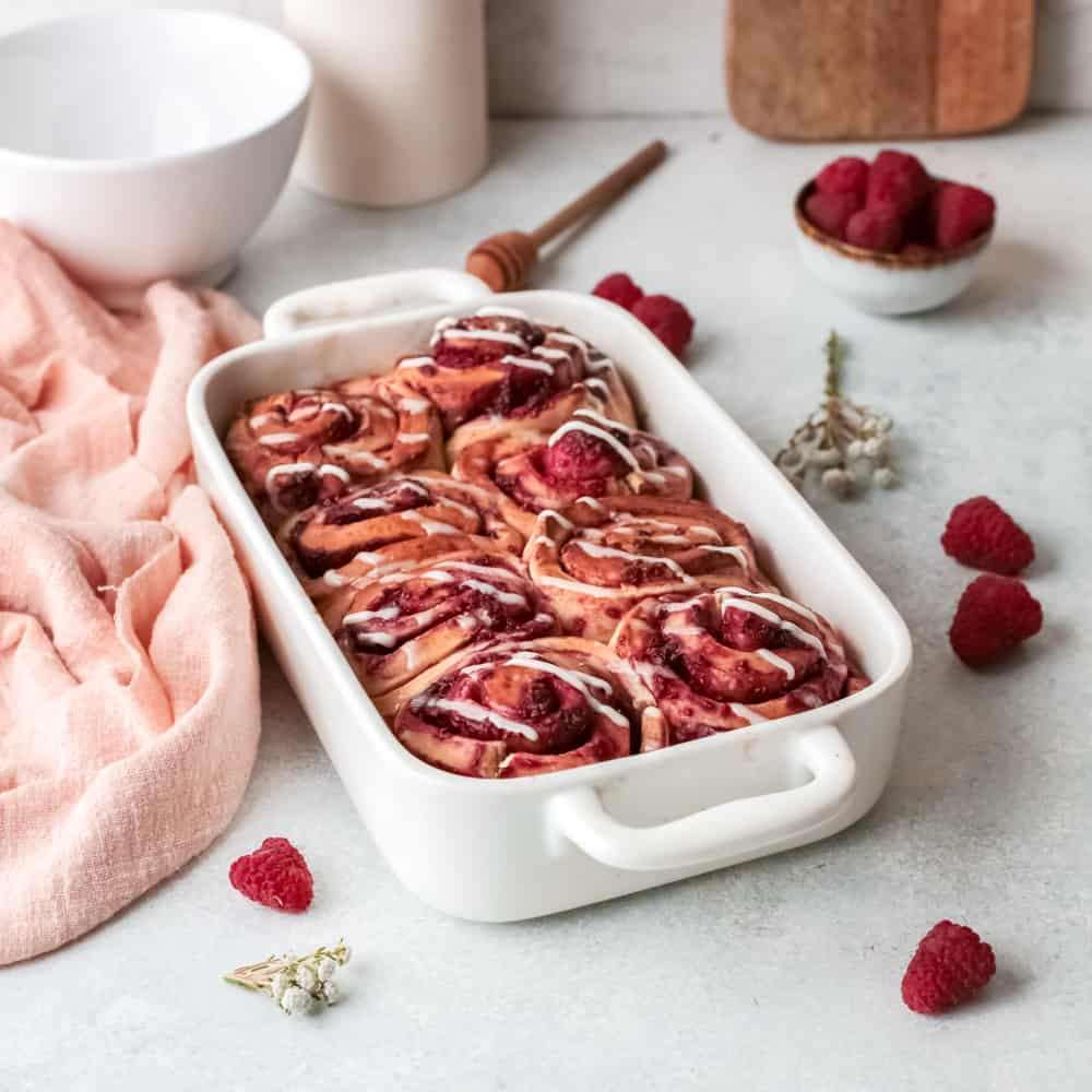 These fresh-baked raspberry cinnamon rolls are filled with fresh and floral raspberries and a touch of cinnamon.