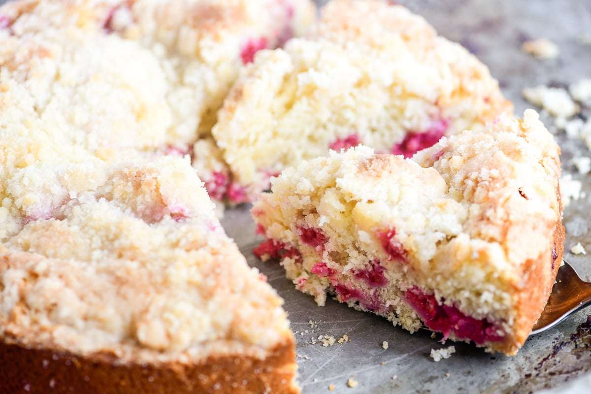 - Blend in the baking powder and salt, then fold in the flour. Finally fold in the frozen raspberries, stirring just enough to get them evenly distributed. Turn the batter into your prepared pan and smooth out evenly. Sprinkle the streusel over the top.