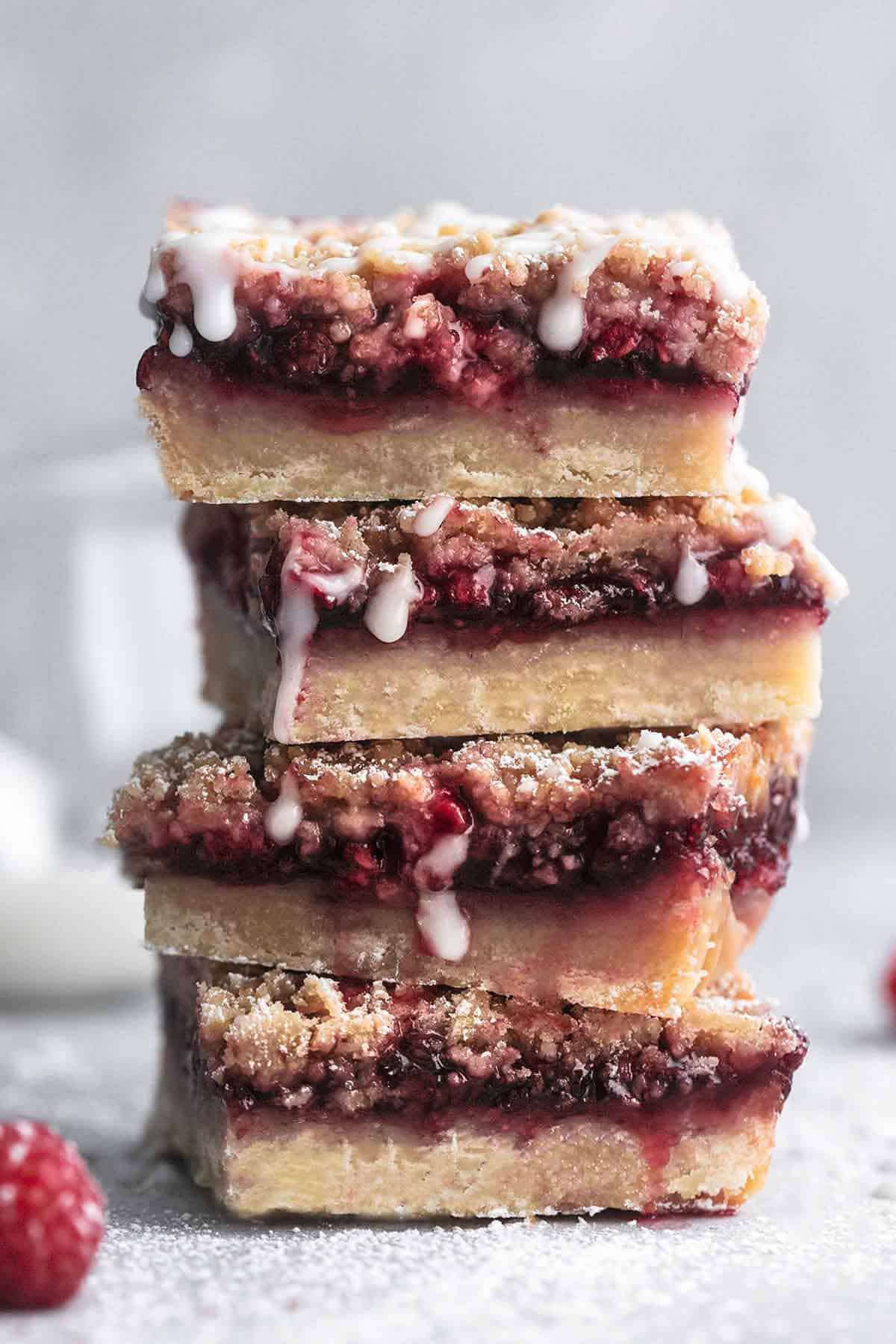 Easiest raspberry crumb bars made with preserves and fresh raspberries sandwiched between a layer of buttery, flaky crust and a sweet, oatmeal topping, plus a glaze for good measure!