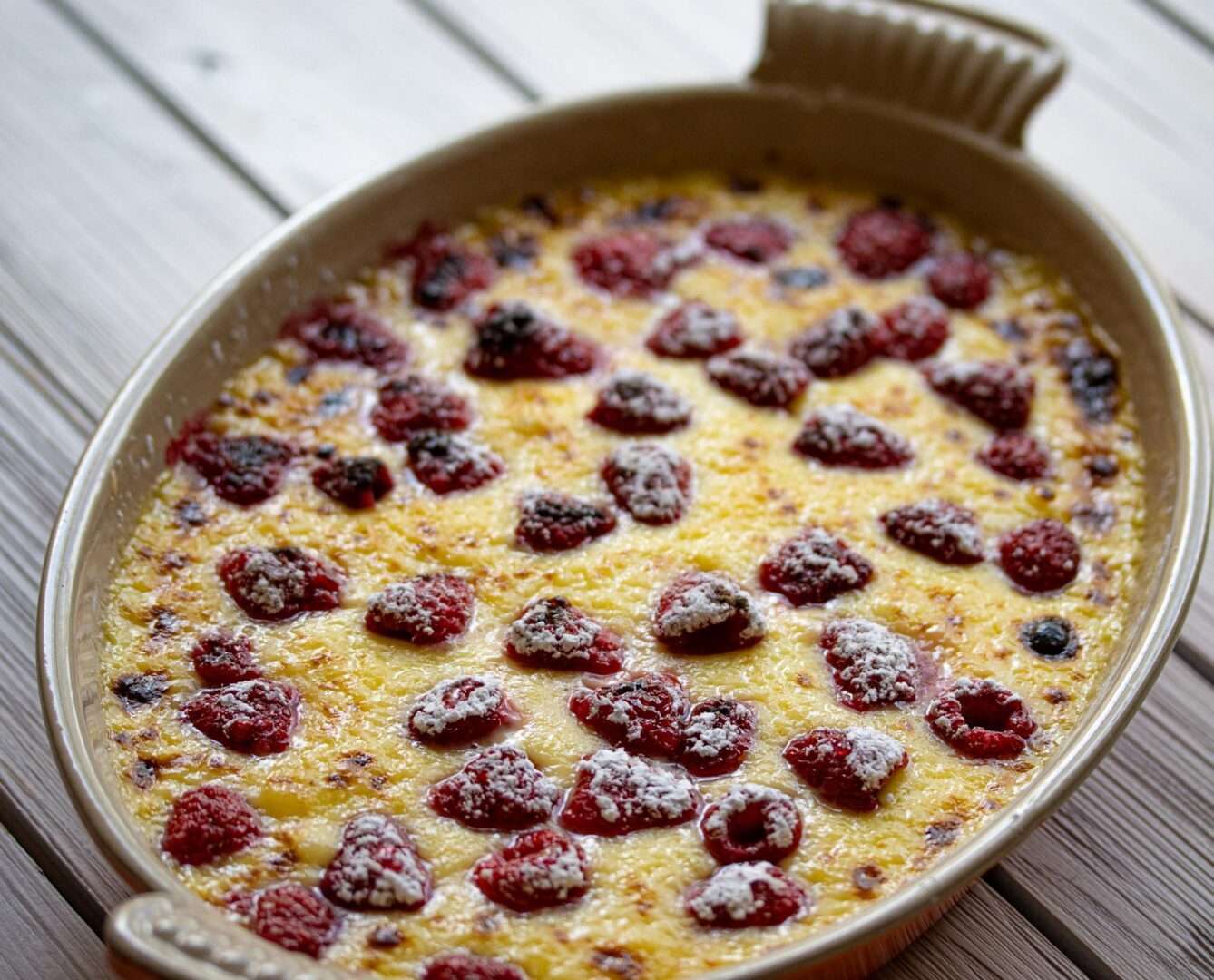 - Preheat the broiler. Toss the raspberries with 1 tablespoon granulated sugar, and scatter half of them on the bottom of a 9 by 9-inch gratin dish. Spoon the custard over the raspberries. Scatter the remaining raspberries on top. Sift the confectioners’ sugar over the top and pass under the broiler for about 7 minutes, until bubbling and gratineed on top.