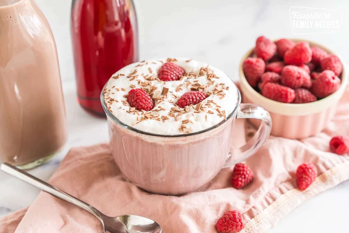 Enjoy a delicious mug of Raspberry Hot Chocolate with our easy Dutch Bros copycat recipe. Don't forget the soft top!