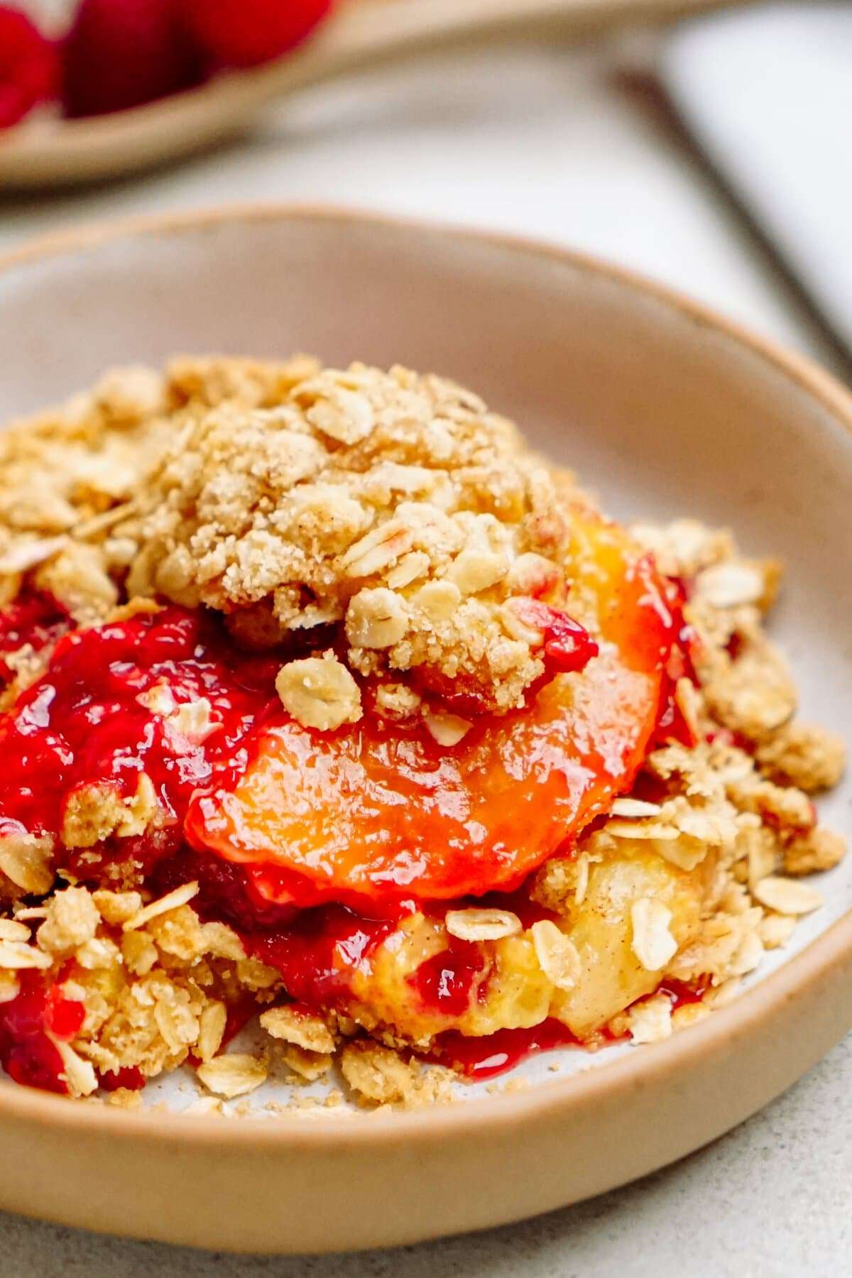 This Raspberry Peach Cobbler Recipe is topped with a crispy oat crumble. Perfect for summer and sharing!