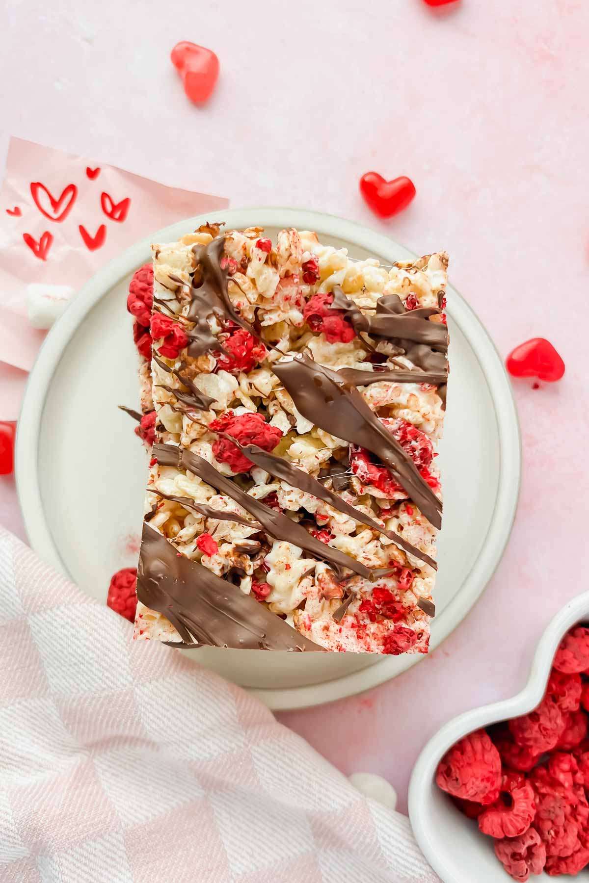 These Raspberry Rice Krispie Treats are soft and chewy with fresh raspberry flavor. They are a Valentine's Day inspired treat with a fun fruity and chocolate mix!