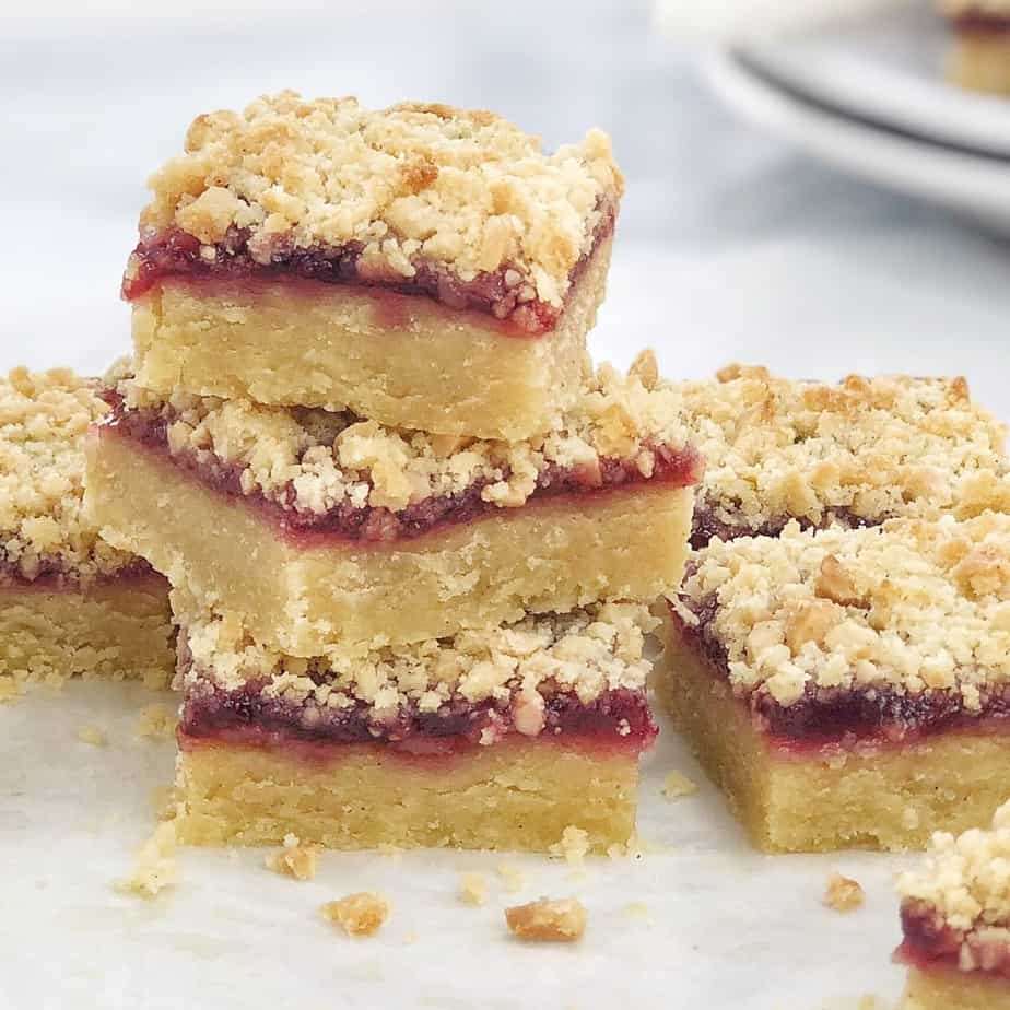 - Sprinkle crumb topping over the jam layer, then bake for a further 15 mins. Leave to cool in tin for a least 30 mins before slicing.