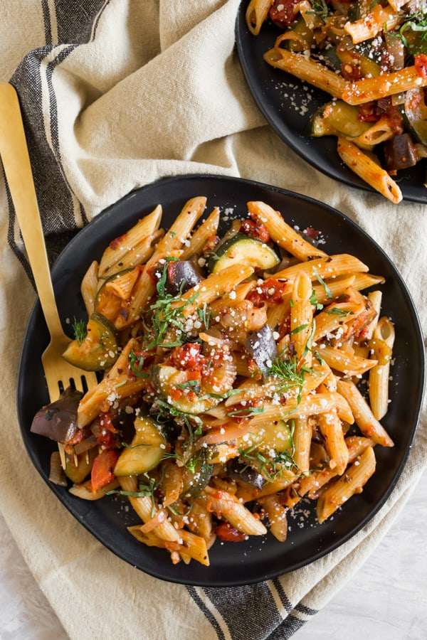 This ratatouille pasta is packed full of eggplant, zucchini, fennel, onion, and tomatoes. It's simple to make and ready in no time! Trust me, you'll love this simple meatless pasta recipe.