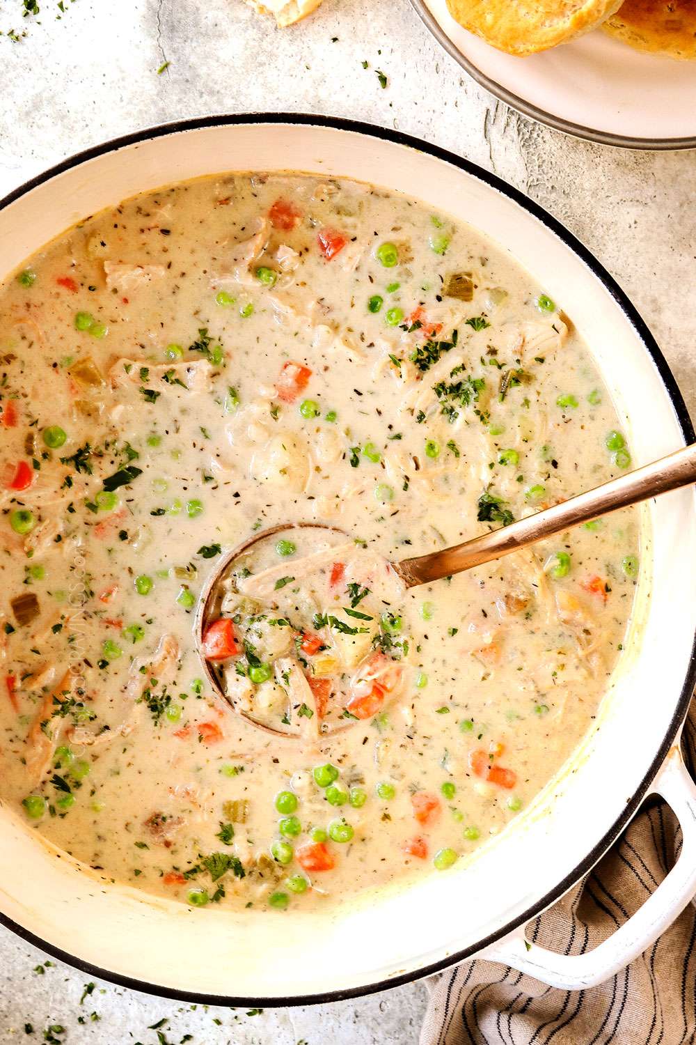 - Consistency: You can make this chicken pot pie soup more or less “chunky” or more or less creamy. For a less chunky soup, simply add additional broth or half and half at the end of cooking. For a thicker soup, add extra cornstarch.