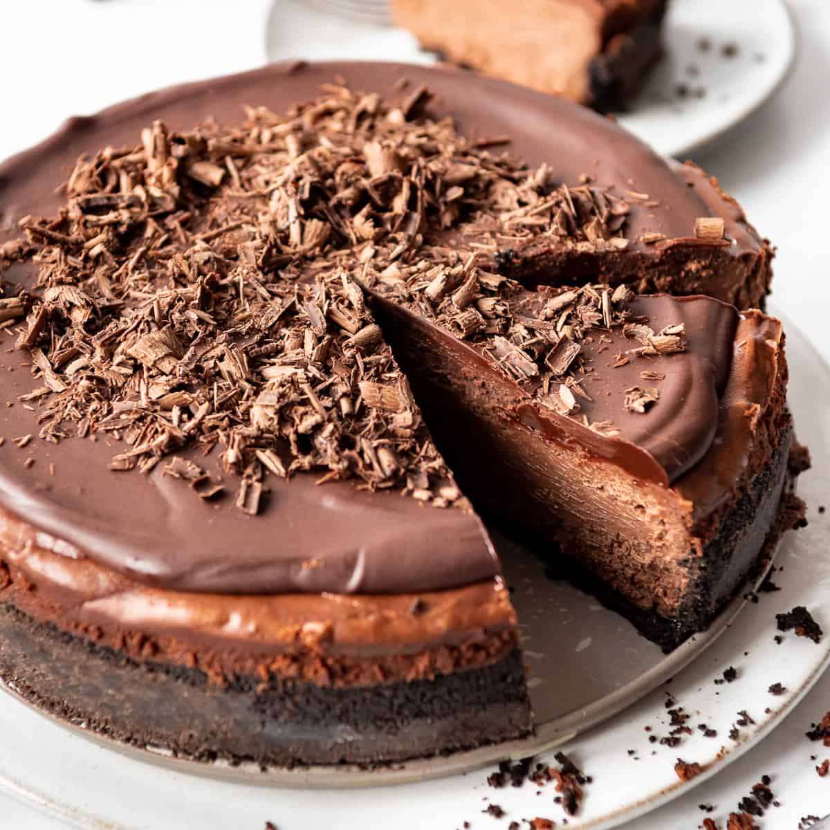 Made with a chocolate Oreo crust, silky cheesecake middle, and topped with a rich and creamy ganache, this Triple Chocolate Cheesecake is the ultimate in chocolate decadence! It's perfect for all occasions - holidays, birthdays, and even Valentine's Day for the ultimate chocolate lover's feast!
