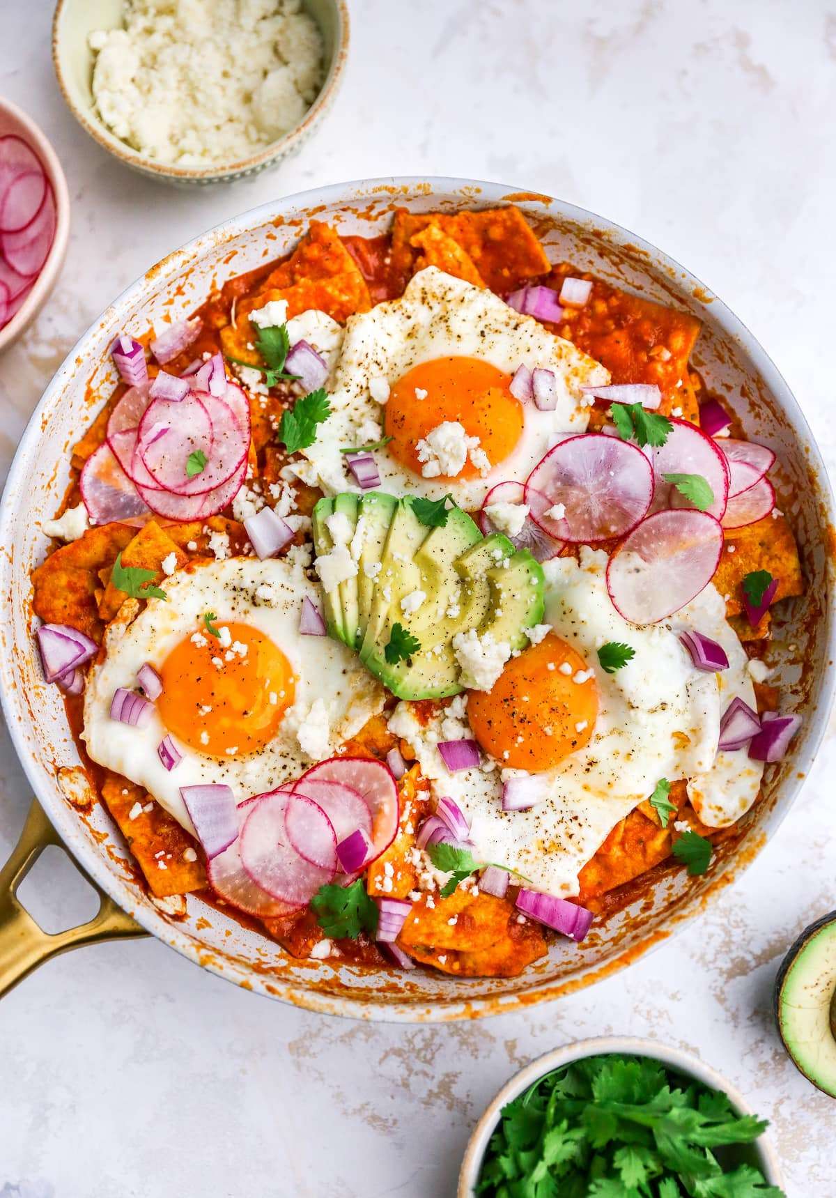 This Red Chilaquiles recipe is a classic Mexican dish that combines crispy tortilla chips in a red tomato sauce topped with a fried egg. It comes together in under 30 minutes and can be served for breakfast, lunch or dinner.