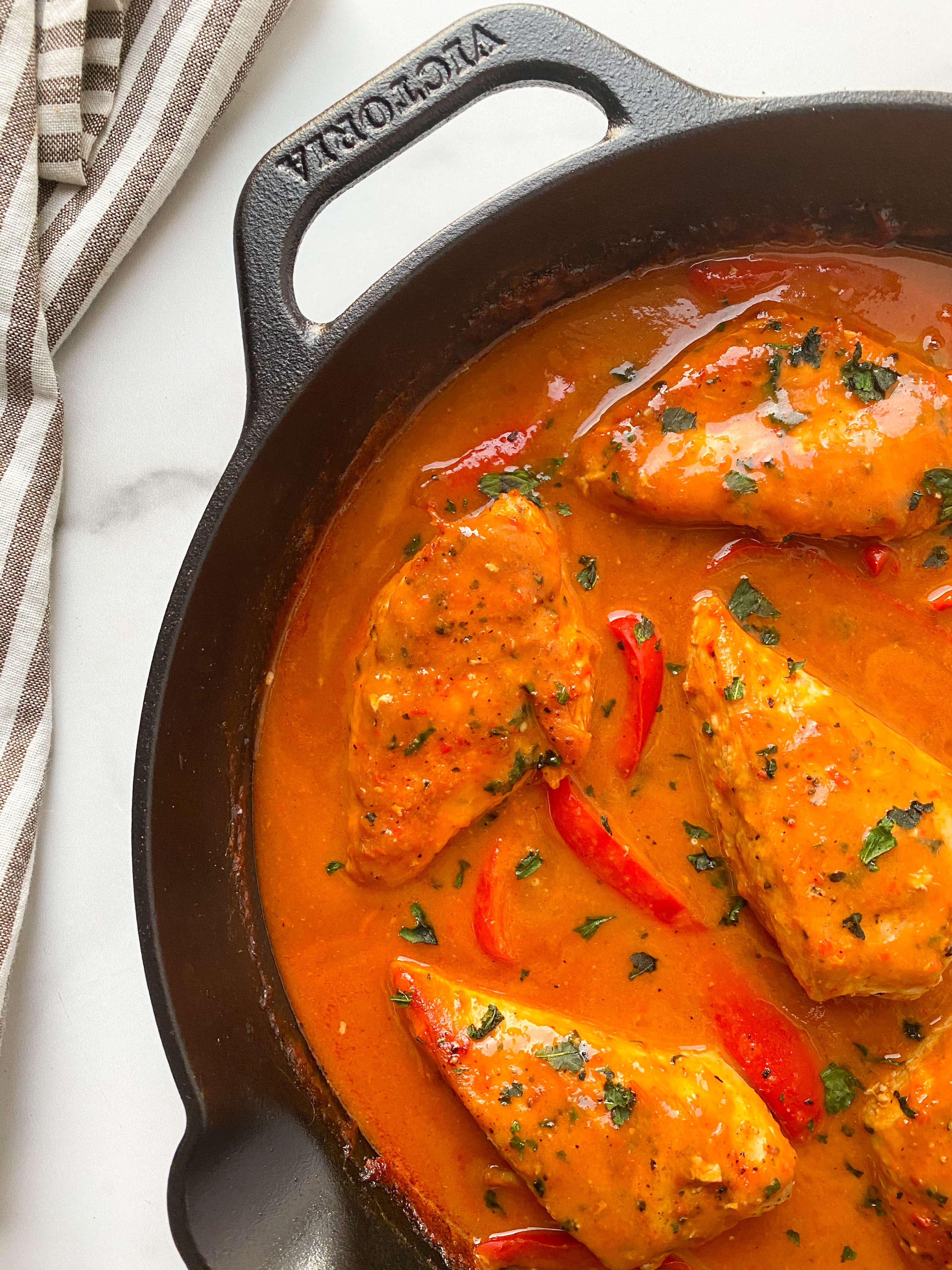 - Serve: Remove from heat and garnish with fresh basil or parsley if desired. Serve the creamy red pepper chicken over quinoa, brown rice, or a bed of steamed vegetables.