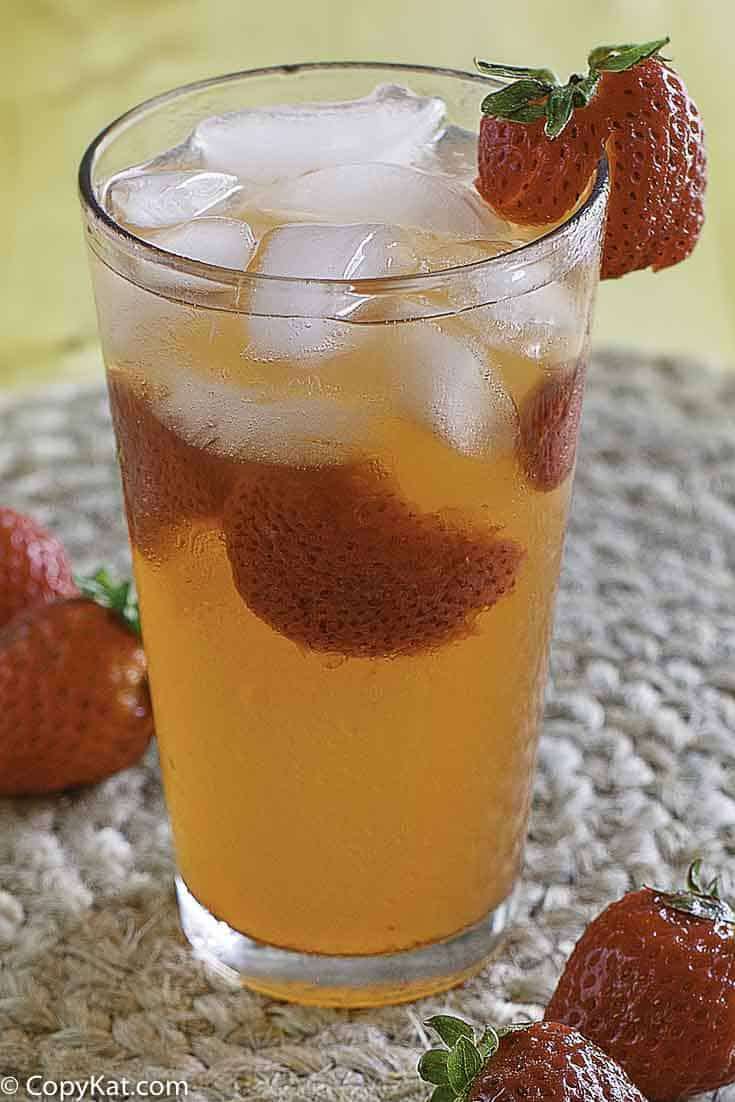 - Place two tablespoons of the strawberries and syrup into the bottom of a tall highball glass. Add lemonade and stir the mixture together. Fill the glass with ice. Garnish with fresh strawberries if desired.