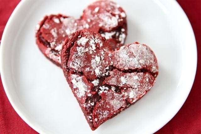 Red Velvet Crinkle Cookies cut into heart shapes for Valentine's Day. Your sweetheart will love these festive cookies.