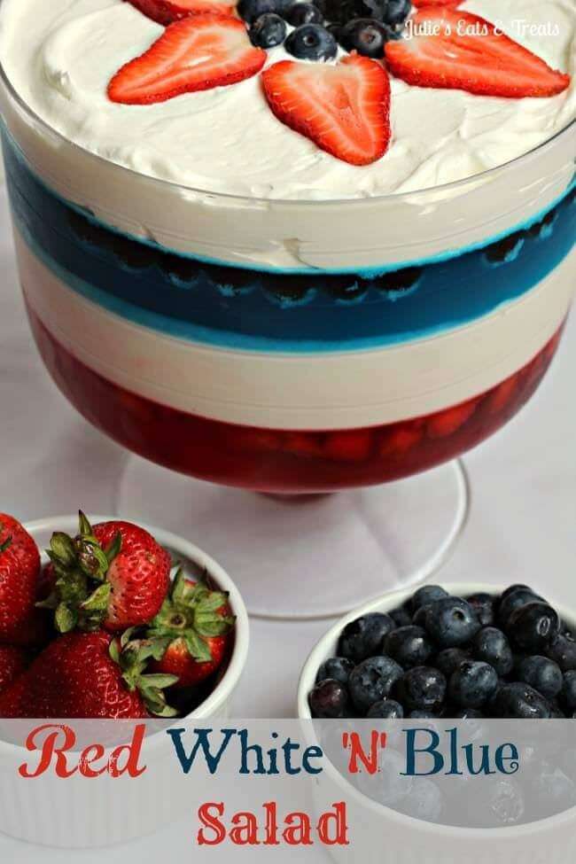 - Dissolve blue jello and 2 c. of boiling water in a medium bowl. Stir in 2 c. cold water and add blueberries. Spoon this mixture over white layer in trifle bowl. Chill until set about 4 hours.