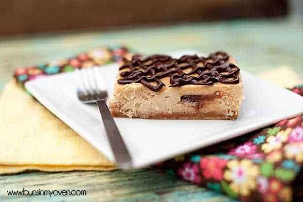 - When serving, cut the bars so that each piece has a peanut butter cup in the center.
