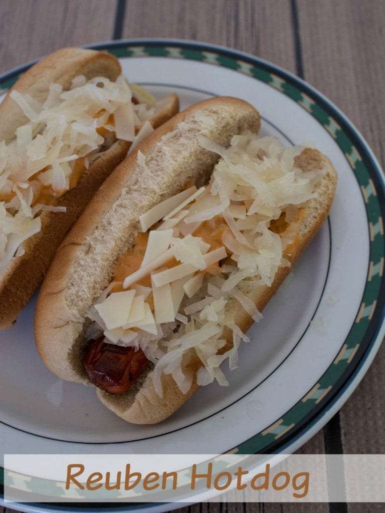 - Put a hot dog in each bun and top with sauerkraut, dressing and Swiss Cheese.