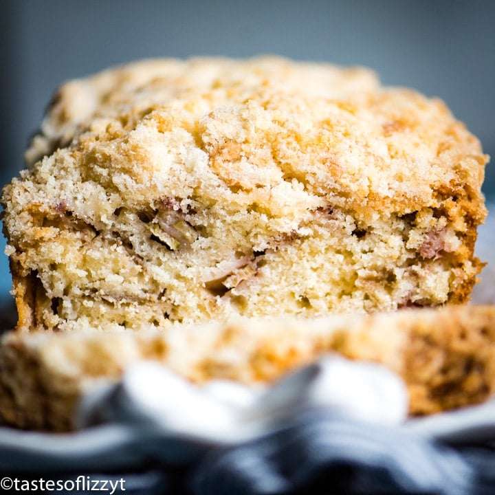 Use up fresh garden rhubarb in this soft and moist rhubarb bread. Buttery crumble gives this quick bread recipe a delicious sweet surprise!