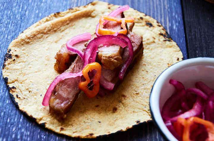 Ribeye steak tacos paired with a fruity, spicy red onion habanero salsa served with warm fresh corn tortillas. The light fruity flavor and acidity of the salsa counterbalance the weighty beefy flavor and fattiness of the meat.