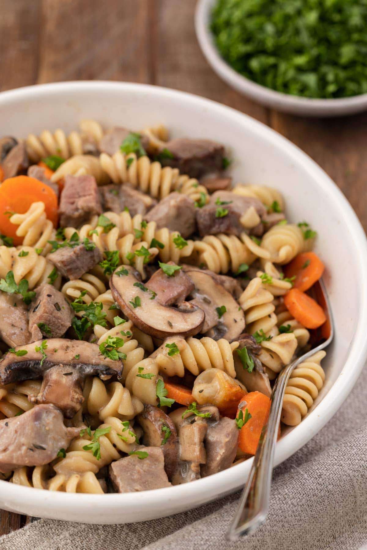 Easy Roast Beef Noodle Casserole – tender roast beef, carrots, mushrooms, and creamy mushroom thyme sauce in a cheesy pasta bake. Try it now!