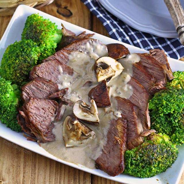 This recipe of Roast beef with cream of mushroom sauce is pot roasted. The beef is so tender and juicy and really easy to make.