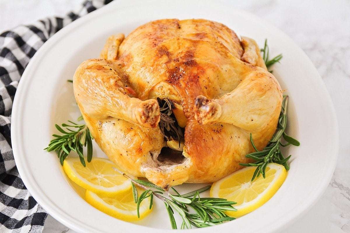 - Sprinkle chicken with salt and pepper. Place lemon and rosemary in the cavity. Tie the chicken’s legs together with kitchen twine. Spread butter over the top of the skin.