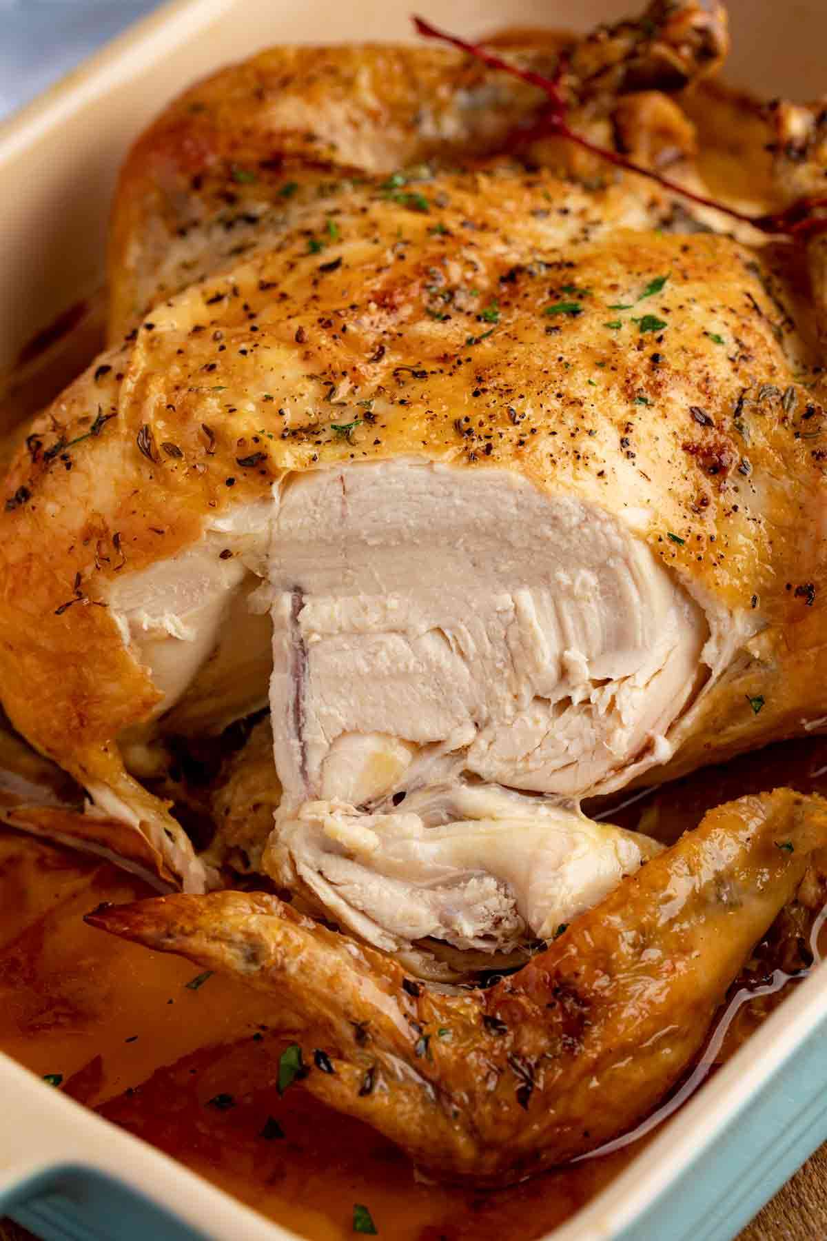 The PERFECT Simple Roast Chicken Recipe that makes the crispiest skin, juiciest chicken with just five minutes of prep and one hour in the oven. Never buy store-bought rotisserie chicken again!