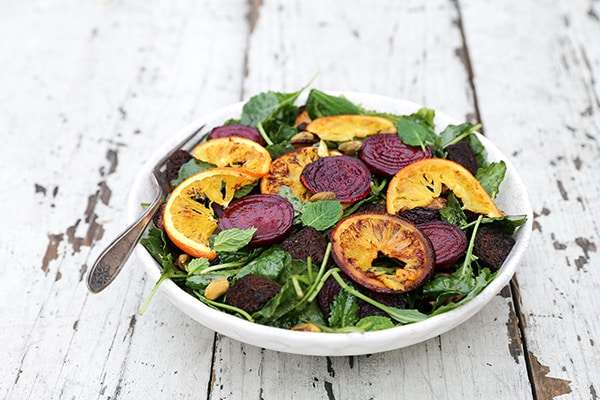 A vegan panzanella salad with rye bread, roasted beets, roasted oranges and baby kale. This is a salad that's worthy of a main meal!