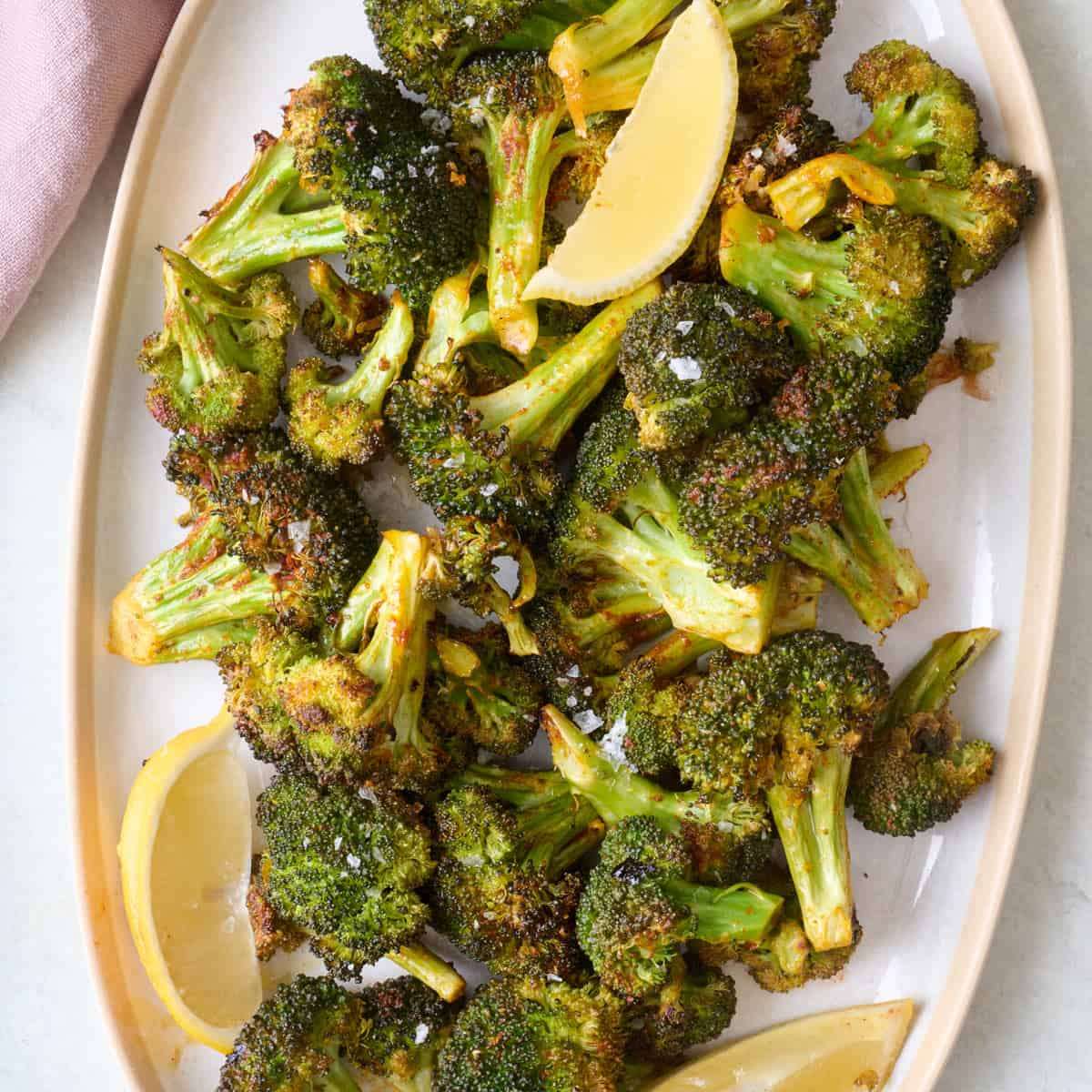 - Transfer the roasted broccoli to a serving platter and add the lemon juice on top.