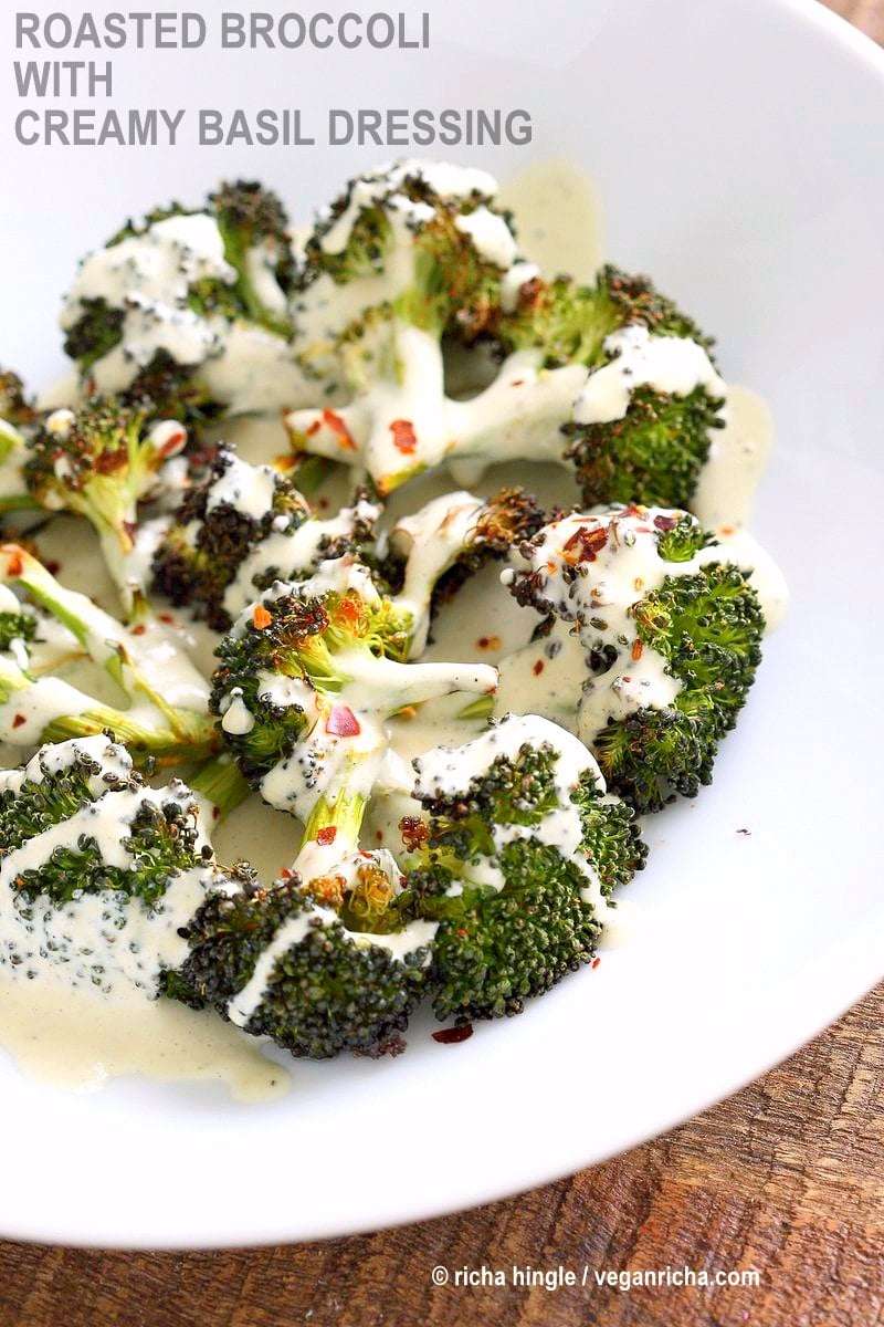 Roasted Broccoli with Creamy Basil Dressing. Broccoli tossed in garlic, cayenne, and baked. Served with cheesy cashew basil sauce. Vegan Gluten-free soy-free Recipe