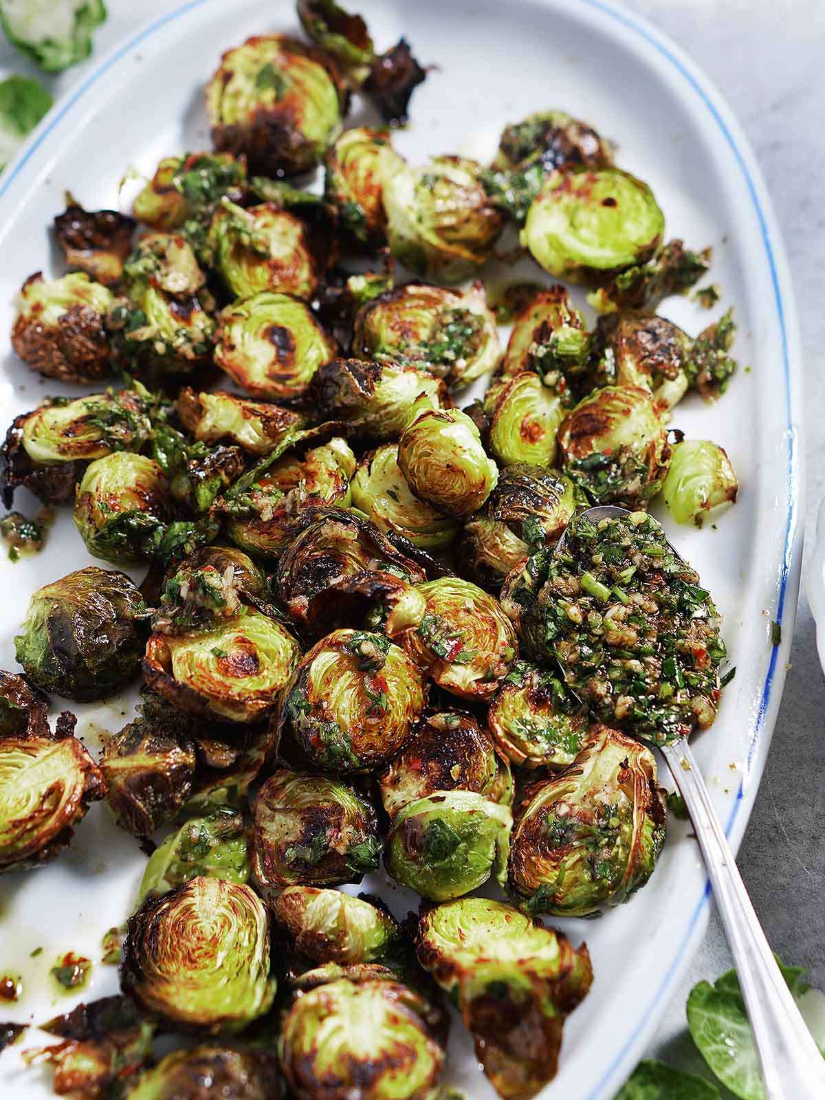 - Transfer brussels sprouts to a serving platter and drizzle with the cilantro chimichurri. Serve immediately.