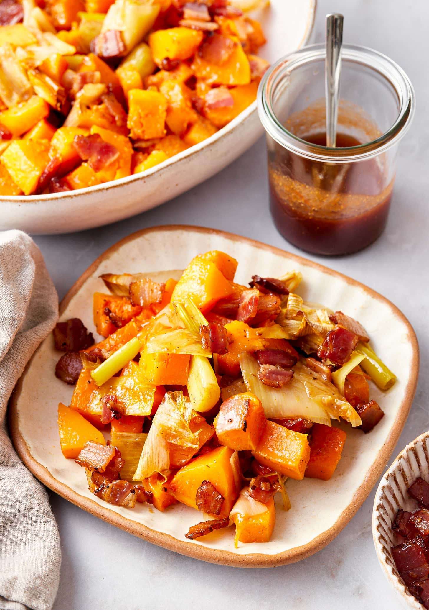 - Place the chopped butternut squash and leeks on the lined baking sheet. Drizzle the bacon grease over the top and toss to coat. Spread the butternut squash and leeks out into a single layer, then sprinkle with salt and pepper and roast in the oven for 30 minutes.