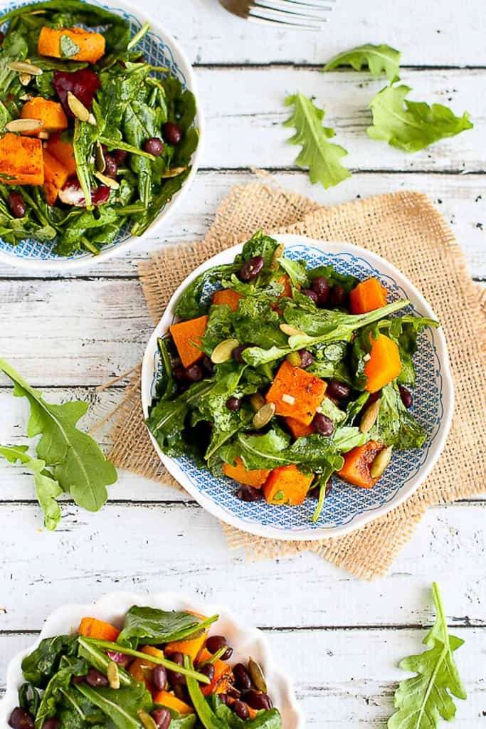 - In a serving bowl, toss the arugula, black beans and pepitas. Add the roasted butternut squash and the dressing, and toss again.