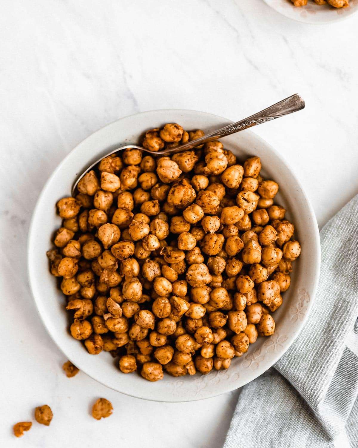 Roasted Chickpeas are full of flavor and perfectly crispy. Toss them in a salad or snack on them plain for a high protein and fiber snack.