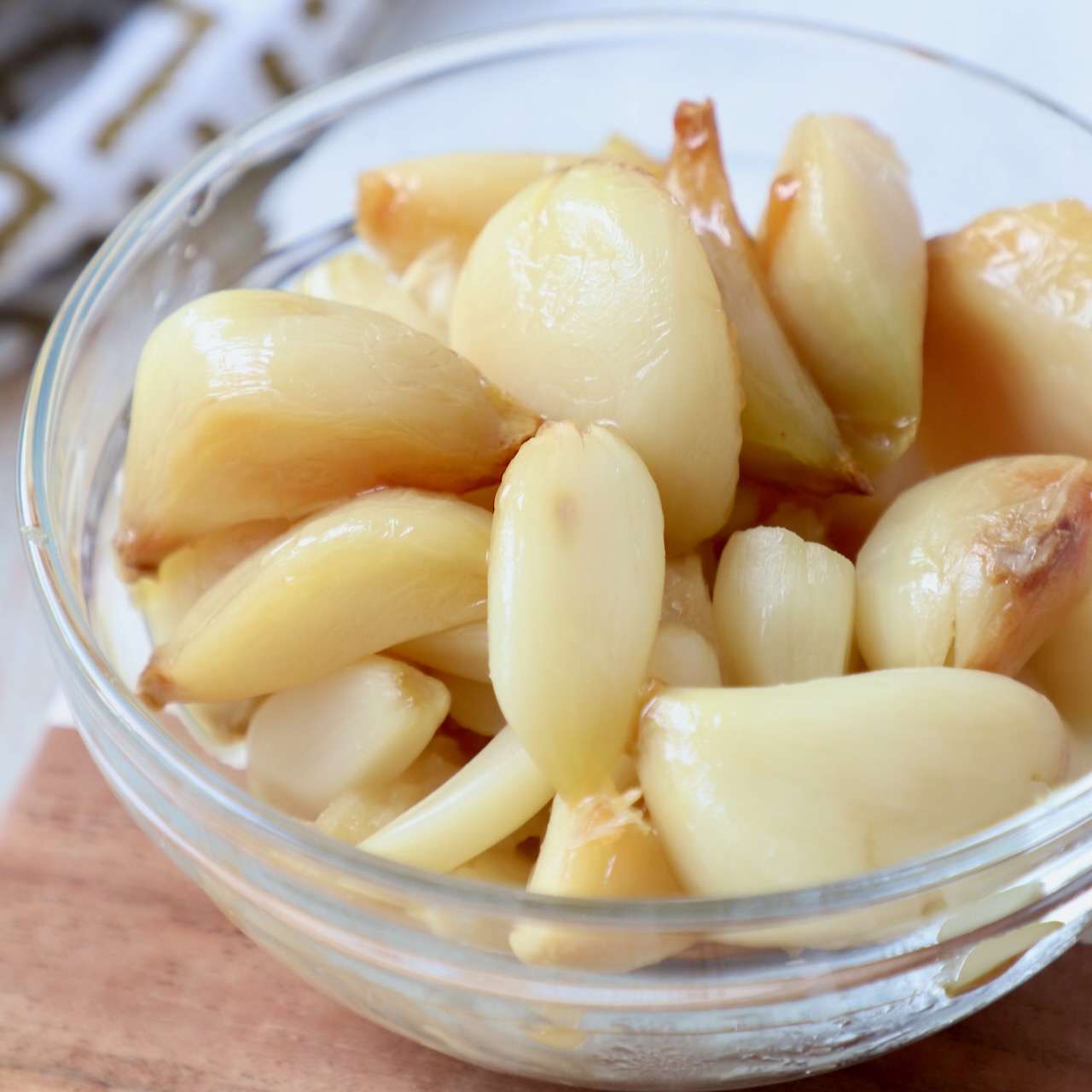 Place 6-12 peeled individual cloves of garlic on a piece of foil and drizzle with 1/2 teaspoon olive oil. Wrap the foil up around the cloves of garlic and place in a 400°F oven for 30-35 minutes, or in an air fryer at 400°F for 20 minutes. Remove from the oven, unwrap the foil packet and use the roasted garlic cloves in your favorite recipes.