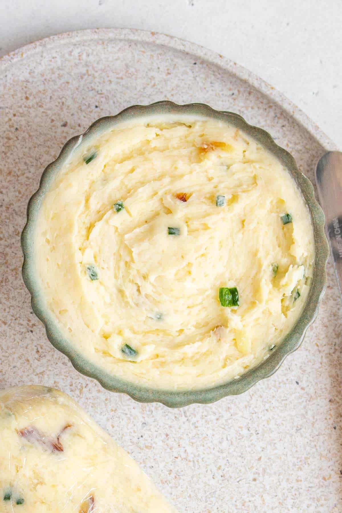 - Add the butter, roasted garlic, salt, and chives to a small bowl.
