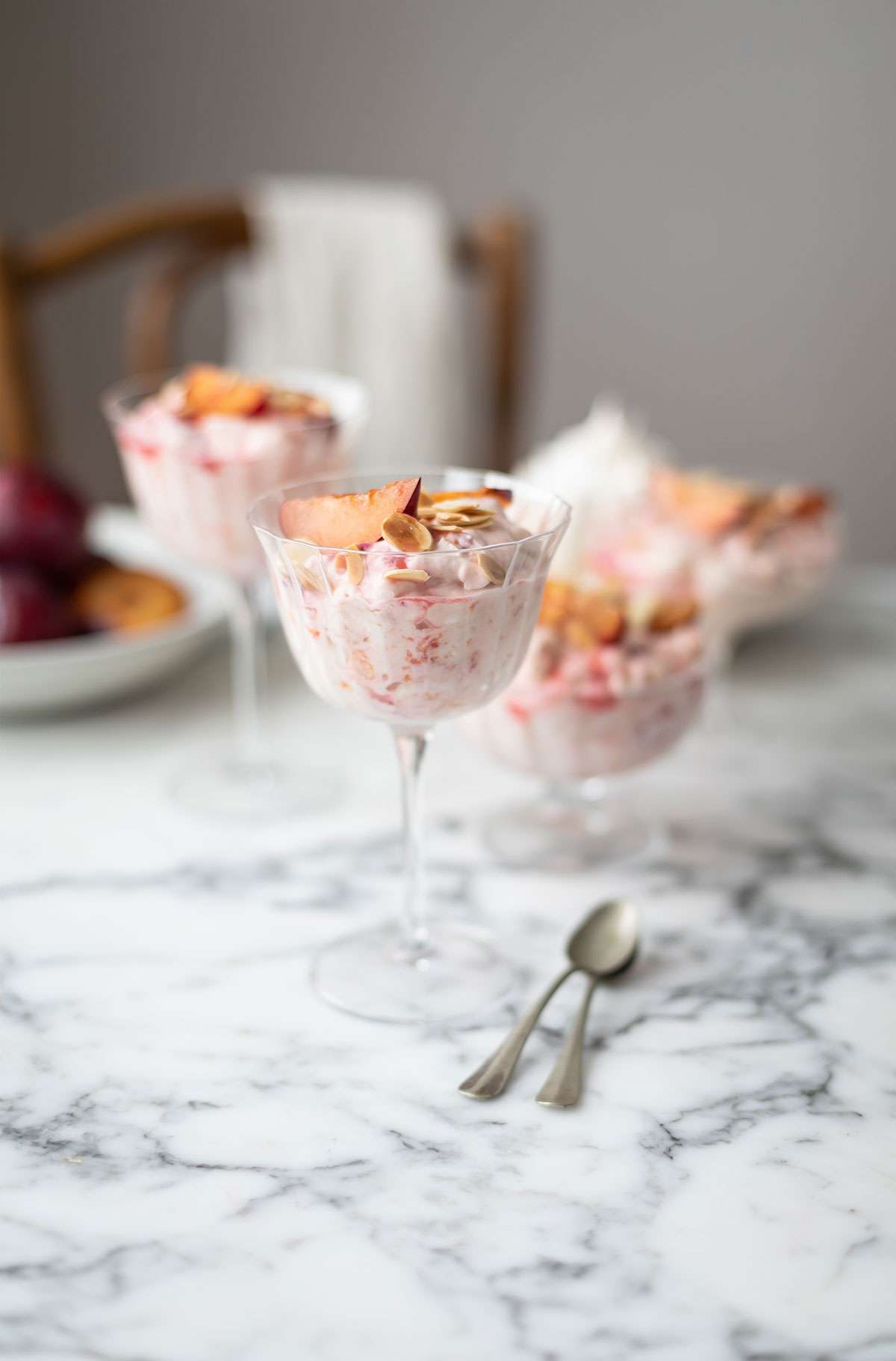 - Spoon this mixture into individual serving glasses and garnish with the plum slices and toasted almonds. Serve immediately or set aside in the fridge until you are ready.