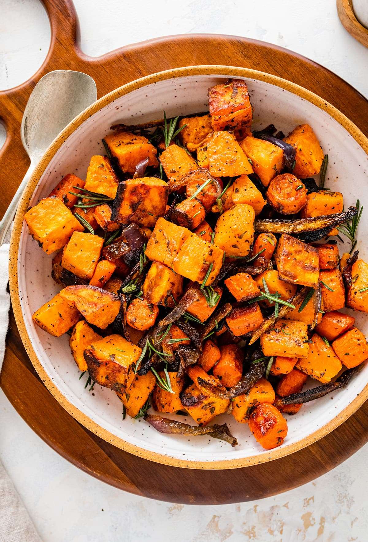 These roasted root vegetables are such an easy and healthy side dish for any meal. Sweet potatoes, carrots and onion are tossed with oil and herbs and roasted until tender and caramelized.