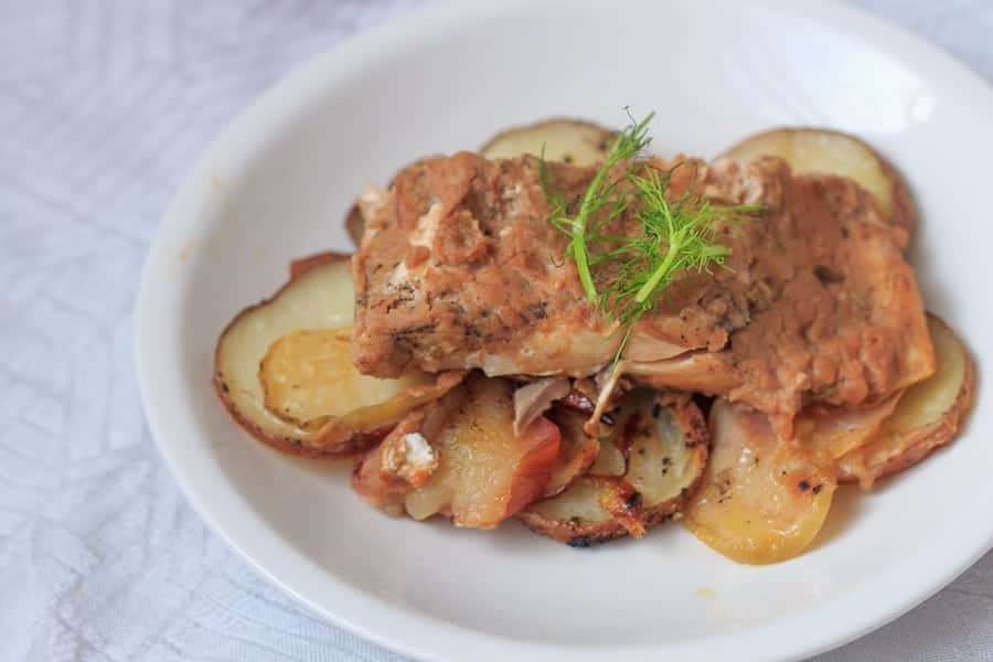 Dressed in spiced apple sauce and cooked to perfection, this baked salmon recipe rests on a bed of naturally sweet, caramelized apples and potatoes. A dish to remember.