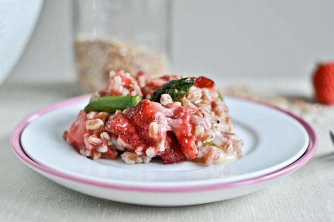 - As soon as oven is hot, toss strawberries with 1/2 teaspoon olive oil and a pinch of salt, then spread on a nonstick pan. Roast for 20-25 minutes, or until caramely, soft and juicy. While strawberries and farro are cooking, heat a small skillet over medium heat, add remaining olive oil, onions, asparagus and a pinch of salt, and saute until soft, about 6-8 minutes.