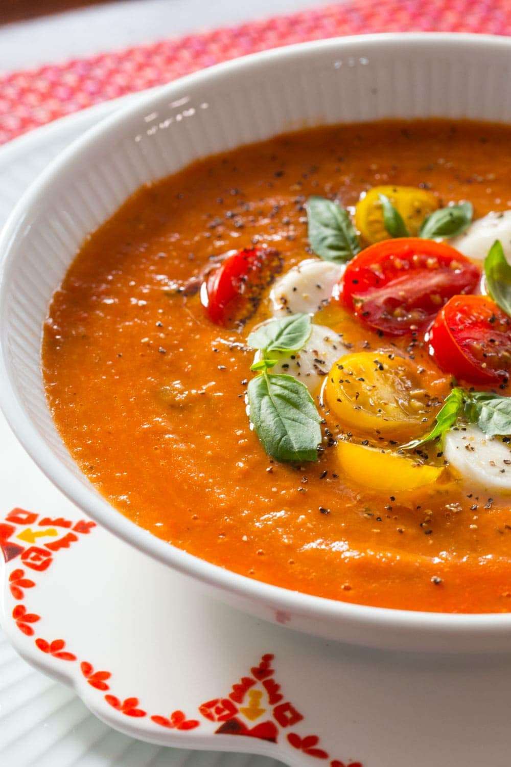 With classic tomato-basil flavor and lots of healthy red lentils, this delicious, unique soup has a wonderful Caprese topping - fresh mozzarella, tomatoes and basil leaves.