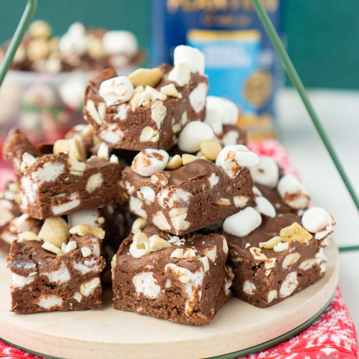 This delicious rocky road fudge recipe combines chocolate with marshmallows and cashews for a creamy and crunchy treat!