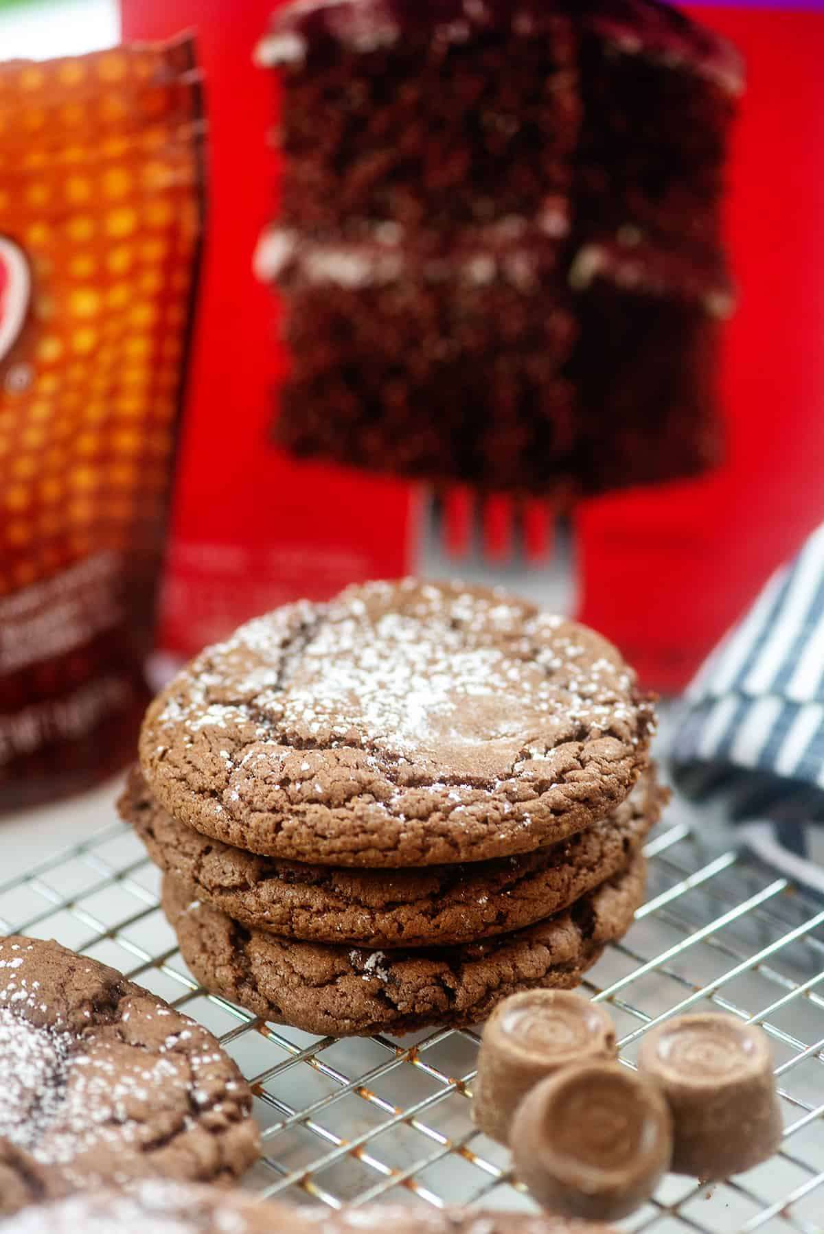 - Spray your hands with non-stick cooking spray and then use a medium cookie scoop to scoop out dough. Roll the dough into a ball. Smash it flat in your hand and place a Rolo in the center. Close the dough around the Rolo. Repeat until all of the dough is used.