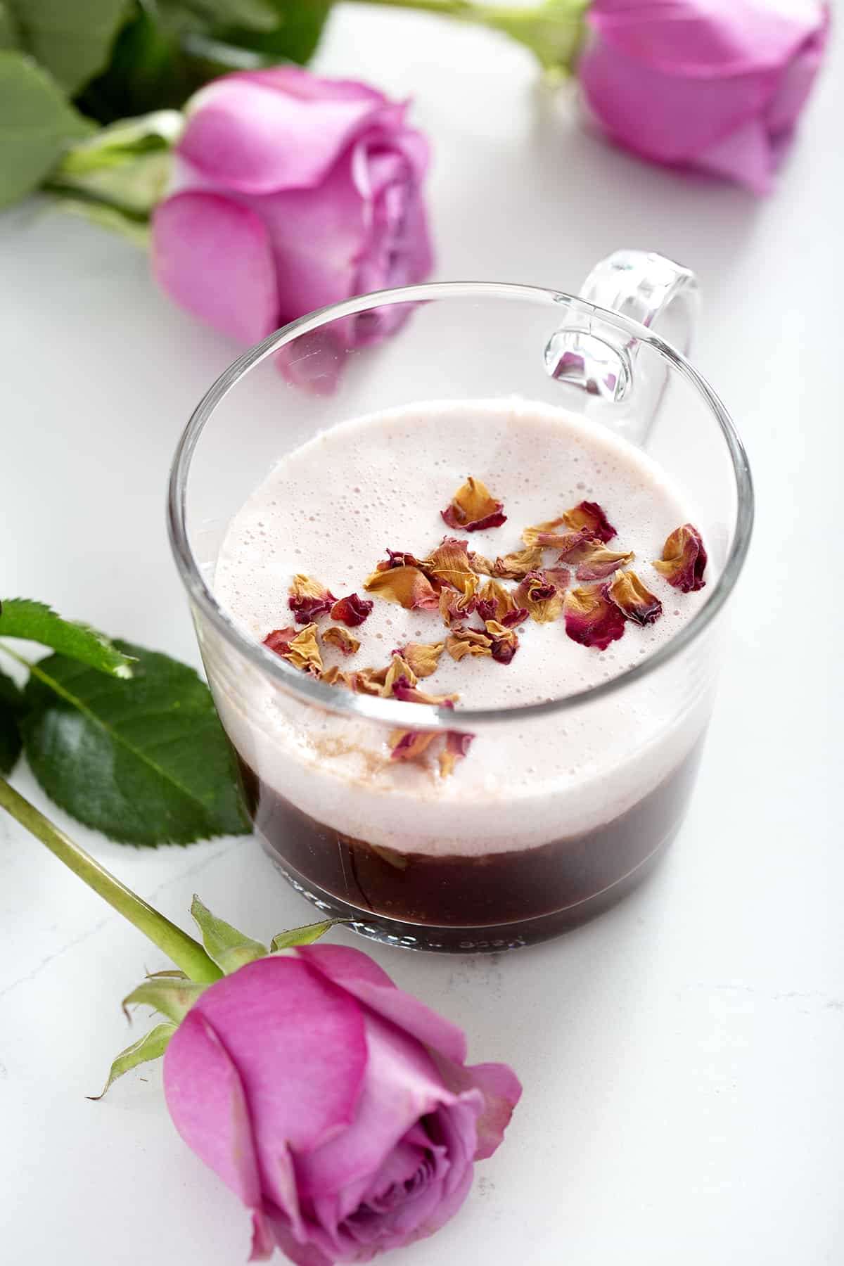 - Pour the coconut milk then pour into the mug. Stir to combine and then serve hot with optional rose petals as a garnish.
