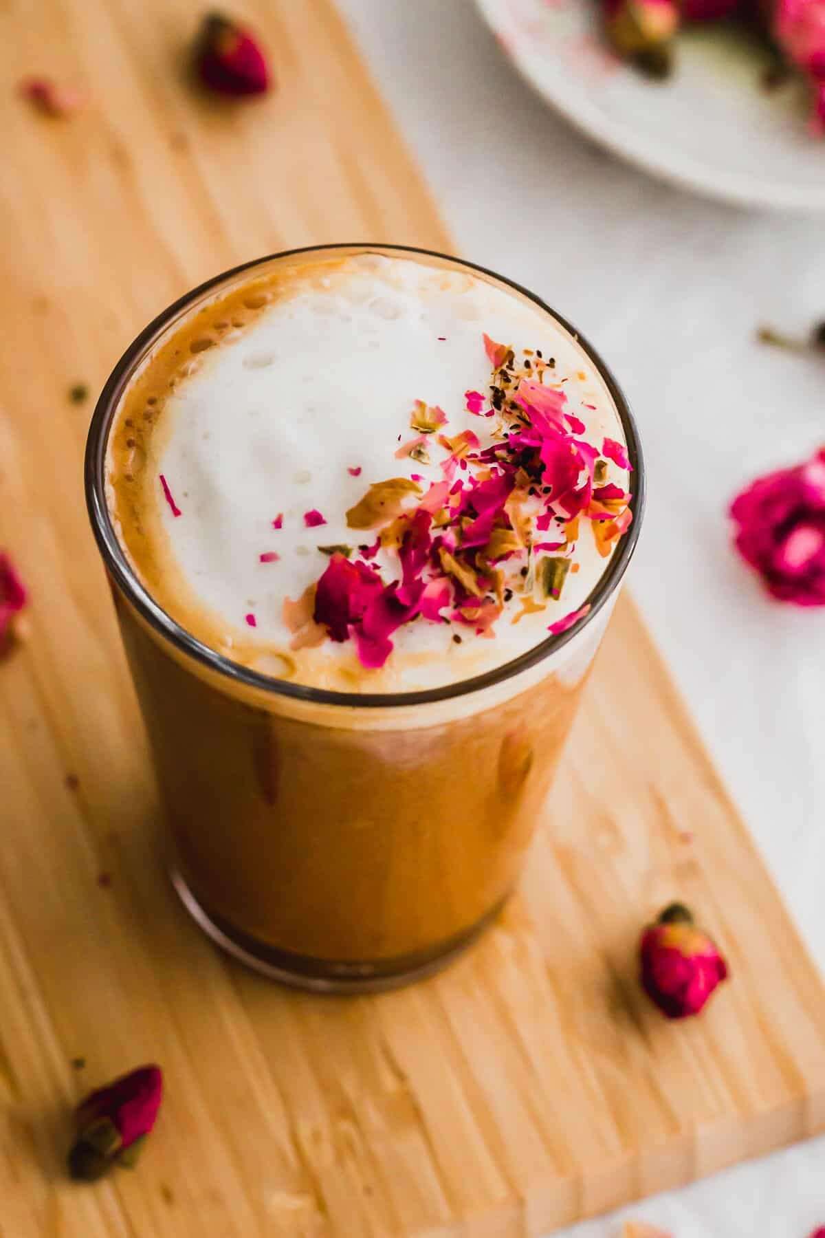 This recipe for Rose Milk Tea Latte features strong black tea flavoured with a homemade rose syrup, rose water and steamed milk. It's an aromatic, delicately floral tea that will brighten your mood.
