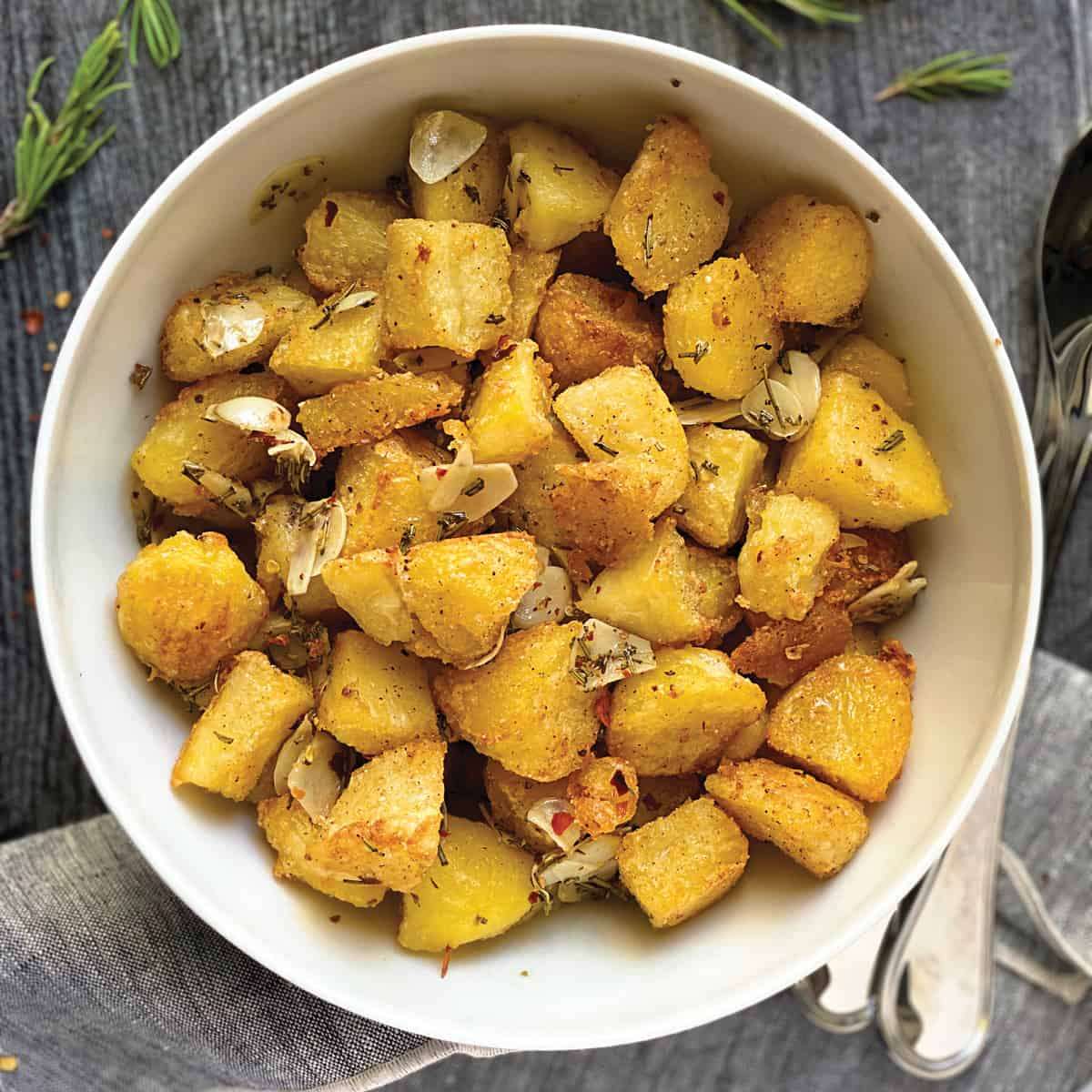 These rosemary potatoes are crispy and golden on the outside while being soft and delicious inside. They are roasted at the last minute with grated parmesan rosemary and garlic.