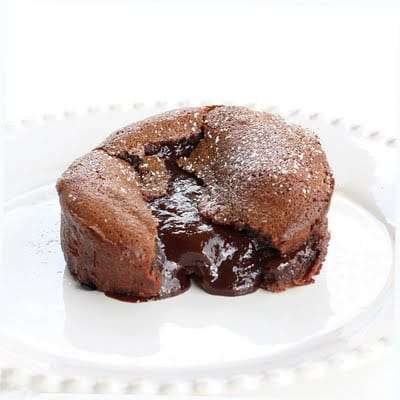 - Fill each ring mold or ramekin with batter ¾ of the way full. Bake on top oven rack for 15-25 minutes; the time will depend on your oven and size of ramekins (for example, I used 1/2 cup of batter for 6 ramekins and baked for 23 minutes). You just want to make sure the tops are set but the middle is still gooey. Since every oven is different, it might be smart to test one. Remove baking sheet from oven. Use a knife to and run it around the edge then carefully invert and place on a serving dish. Sprinkle with powdered sugar if desired. Serve immediately. You can serve it with a scoop of ice cream, whipped cream, or by itself.