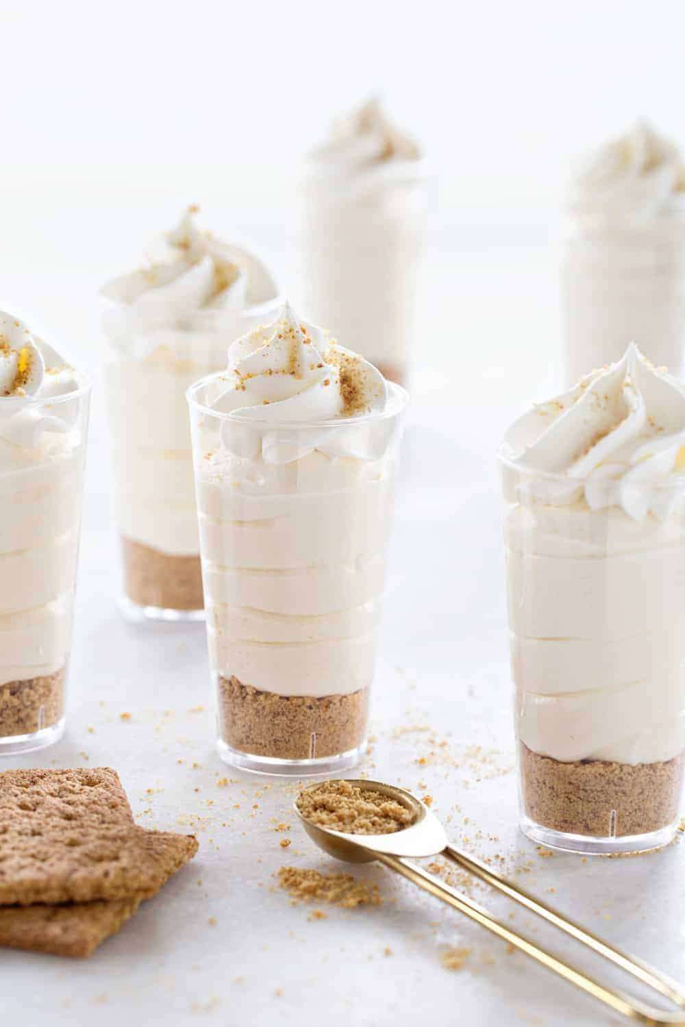 - Evenly divide the graham cracker crumbs between 16 plastic shot glasses, or souffle cups.