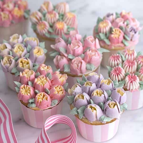 - Smear a thin layer of buttercream onto a cupcake or the surface of your cake. This will allow the piped flowers to adhere to the surface.