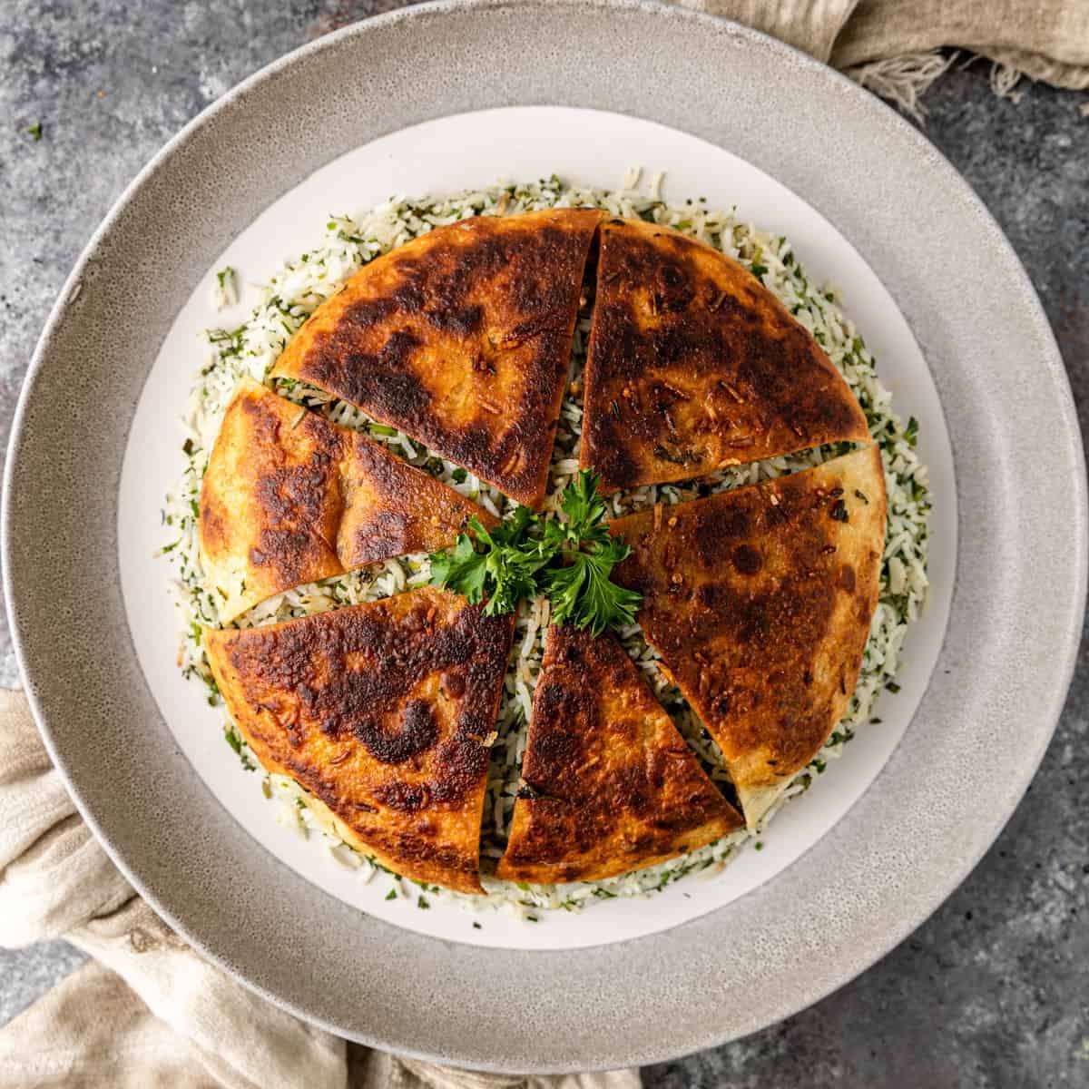 - Run a rubber spatula around the inside of the pot to release any food that's sticking to the sides.Place an appropriate-sized serving platter over the top of the pot. Quickly and confidently, flip the pot and platter over. There will be a swishing sound as the tahdig releases. You can watch the process in my other Persian Tahdig recipe video.Alternatively, use a large spoon and scoop the rice onto a platter. Gently remove the tahdig whole or in pieces, and serve it on the side or over the top of the rice.